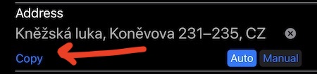 Ermöglicht das Kopieren der automatisch aufgelösten Adresse aus dem Notizfeld: