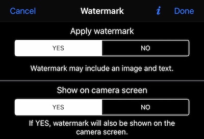 Konfigurieren Sie es über Einstellungen> Aufnahmeeinstellungen> Abschnitt Wasserzeichen. Durch Tippen auf eine Wasserzeichenabschnittszeile wird der Wasserzeicheneditor geöffnet. Im oberen Bereich können Sie festlegen, ob ein Wasserzeichen angewendet und auf dem Kamerabildschirm angezeigt werden soll: