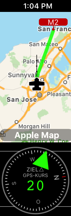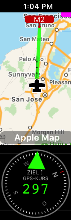 Im obigen Beispiel ist der Kurs für das Ziel 297 Grad und wir sind ein bisschen weg als Kurslinie auf einer Karte und der grüne Pfeil sagt uns. Beachten Sie auch, wie früher “ZIEL” jetzt “ZIEL ⇡” zeigt, um Ihnen einen Hinweis zu geben, dass dies ein “Lenkkurs” ist, kein Diff.