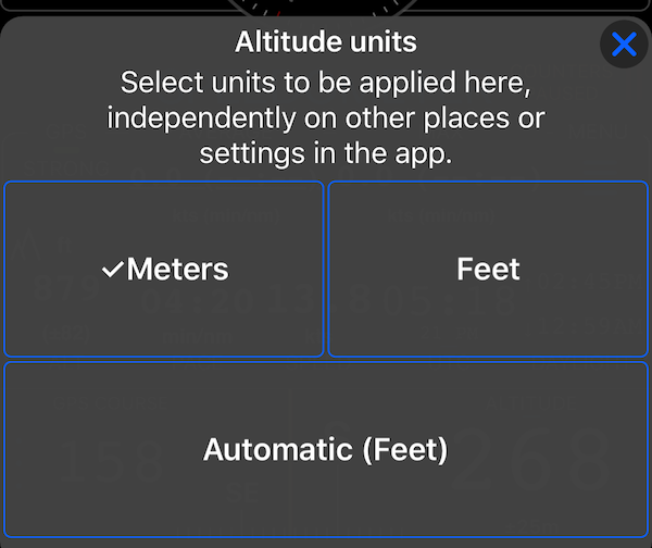 Auf Wunsch des Piloten können Sie die Höheneinheiten hier völlig unabhängig von den App-Einstellungen ändern. Auf diese Weise können Sie die Höhe in allen für die Situation erforderlichen Einheiten überwachen, ohne die Einstellungen der App-weiten Einheiten neu konfigurieren zu müssen. Um die Einheiten hier einzustellen, tippen Sie auf ein Höhenlabel: