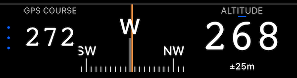 Zeigt die aktuelle Richtung an, die entweder auf einem magnetischen Kompass oder einem GPS-Kurs basiert. Plus Höhe.