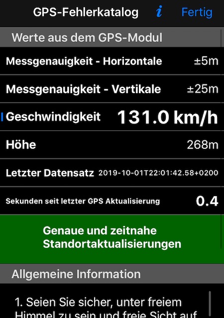 Der Bildschirm enthält auch kurze Schritte zur Fehlerbehebung, die zur Verbesserung der Positionsgenauigkeit erforderlich sind. Dies gilt sowohl für allgemeine Szenarien als auch für Züge oder Flugzeuge.