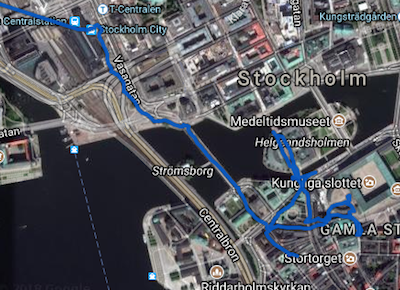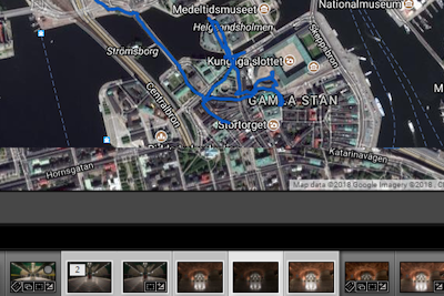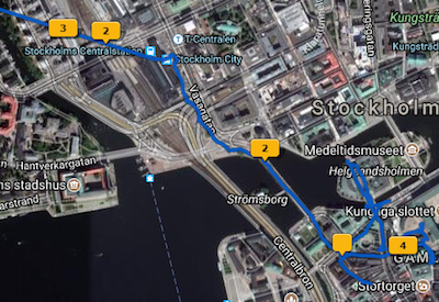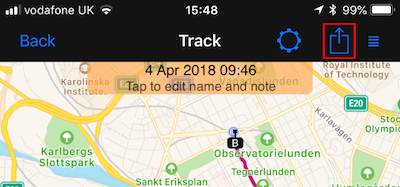 Dadurch wird der ausgewählte Track auf eine Karte geladen, wie Sie in Stockholm sehen können. Tippen Sie auf die Box mit dem Pfeil (rot hervorgehoben)