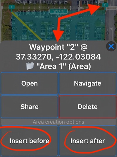 Das Bild oben zeigt, dass beim Tippen auf einen Bereichspunkt Optionen für “Einfügen vor” und “Einfügen nach” angezeigt werden. Für die Routenpunkte sind die gleichen Optionen verfügbar.