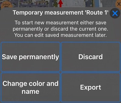 Und bietet auch Optionen, um die temporäre Messung zu speichern, zu verwerfen, umzubenennen, zu ändern oder zu exportieren: