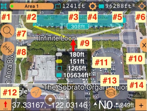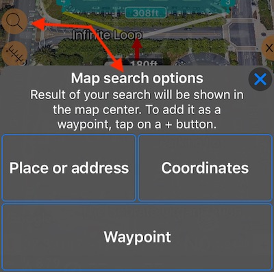 Um entweder “Fläche” oder “Route” Punkte hinzuzufügen, verschieben Sie die Kartenmitte an die gewünschte Position und tippen Sie auf die Schaltfläche “+”. Um das Kartencenter zu verschieben, können Sie einfach auf einer Karte wischen / schwenken oder die Suchtaste (# 7) verwenden, um die Suchoptionen zu öffnen: