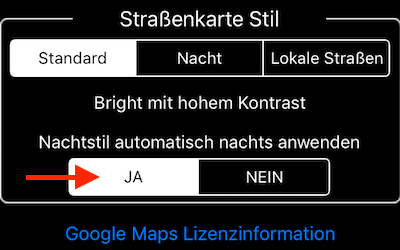 Neue Option, um Google Night Map-Stil automatisch in der Nacht gelten. Es war eine Schande, Informationen über den Sonnenuntergang / Sonnenaufgang in der App zu haben, aber nicht, um den Kartenmodus-Schalter zu erzwingen. Standardmäßig ist die Option auf NO verlassen, bitte besuchen Sie die Google Map-Einstellungen, um Ihre Einstellungen zu ändern: