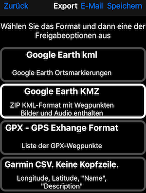 Wegpunkte Export in GPX, Google Earth KML oder KMZ Formate.