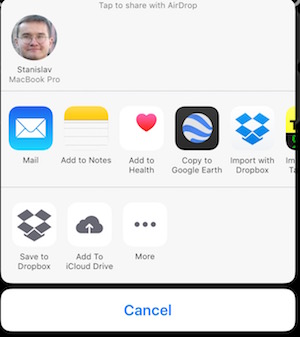 Sobald Sie die Zeile mit dem Ziel-Exportformat auswählen, werden die Optionen “E-Mail” und “Speichern” angezeigt. “E-Mail” -Option fügt die Export-Datei, um die E-Mail als Anhang. “Speichern” bietet Optionen zum Speichern der Export-Datei auf iCloud Laufwerk, Dropbox, Google-Laufwerk und alle anderen “Laufwerk” für die Sie möglicherweise die entsprechende “Laufwerk” -App installiert haben. Wenn Sie Airdrop auf Ihrem Mac aktiviert haben, wird es dort auch angezeigt. Hier ein Beispiel aus meinem iPhone: