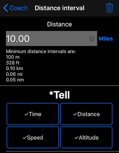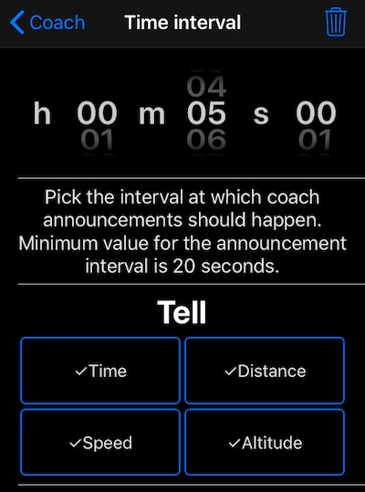 Wenn aktiviert und konfiguriert, teilt Ihnen Voice Coach die aktive Entfernung und Dauer des Tracks sowie die aktuelle Geschwindigkeit und Höhe mit.