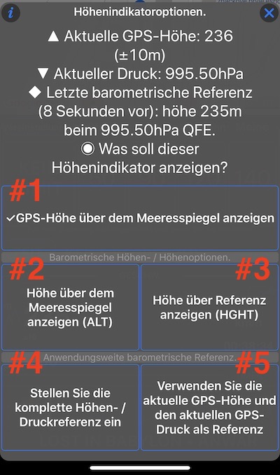 Das Höhenindikatormenü bietet eine Option zur Verwendung der aktuellen GPS-Höhe und des Luftdrucks als Referenz (# 5) oder Sie können die Option “Vollständige Höhen- / Druckreferenz einstellen” (# 4) verwenden, um eine beliebige Übereinstimmung zwischen Höhe und Druck festzulegen: