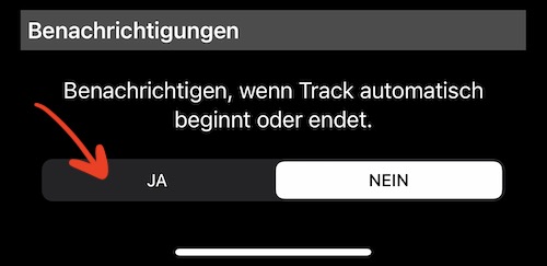 Es kann ein tolles Gefühl sein zu wissen, dass die App den Track gestartet hat und wie viel sie verfolgt hat, als sie den Track gestoppt hat. Scrollen Sie, während Sie sich noch auf dem Einstellungsbildschirm für das automatische Tracking befinden, zum Abschnitt „Benachrichtigung“ und tippen Sie auf JA, um benachrichtigt zu werden, wenn Tracks gestartet oder gestoppt werden: