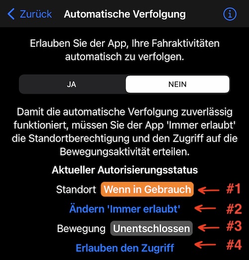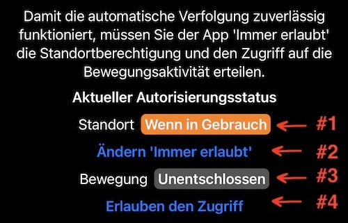 Standardmäßig fragt die App beim ersten Start nach der Standortautorisierung „Wenn in Gebrauch“ und das war’s. Um Tracks automatisch starten und stoppen zu können, muss die App den Zugriff auf den Standort “Immer erlauben” und auch Zugriff auf “Bewegung” haben.