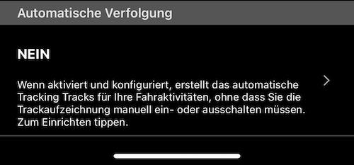 Standardmäßig ist die automatische Verfolgung ausgeschaltet. Tippen Sie auf eine Einstellungsschaltfläche in der Schaltfläche „NEUE STRECKE“, um den Einstellungsbildschirm für die GPS-Verfolgung zu öffnen. Scrollen Sie zum Abschnitt “Automatisches Tracking”: