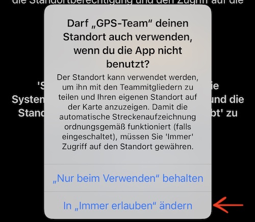 #1 ist die aktuelle Standortautorisierung, standardmäßig „When in Use“. Wir brauchen hier “Immer zulassen”. Tippen Sie auf „Auf Immer zulassen ändern“.