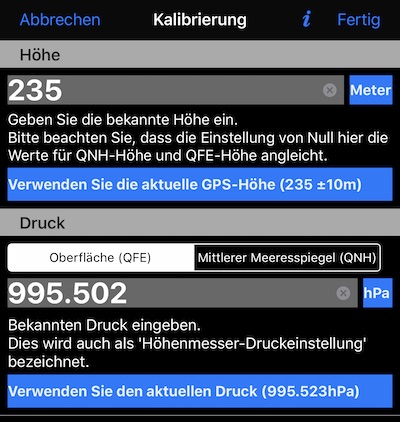 Zu den Kalibrierungsoptionen zählen das Einstellen der Höhe und der entsprechenden Fläche (QFE) oder mittlerer Meeresspiegeldruck (QNH).
