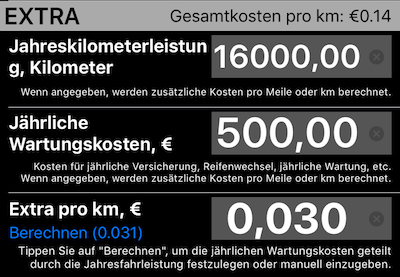 Wie das obige Beispiel zeigt, beträgt meine jährliche Meilenzahl 10 km, die jährliche Kosten liegen bei 600 $, das ergibt 0,06 $ extra pro Meile (App zeigt Ihnen einen “Berechnen” Button, so dass Sie sich nicht selbst berechnen müssen gefahrene Kilometer und jährliche Kosten).