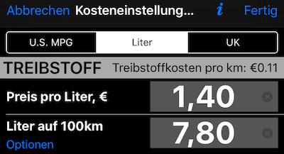 “Kilometer pro Liter” Kraftstoffeffizienzoption für “Liter” Kraftstoffeinstellungen