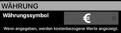 Hier können Sie ein Währungssymbol einrichten, das immer dann verwendet wird, wenn kostenbezogene Werte angezeigt werden: