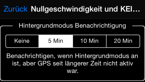 Tachometer meldet nun, wenn Sie das Tracking im Hintergrund arbeiten lassen, es aber seit längerer Zeit keine GPS-Aktivität gab. Einstellung in „Erweiterte Einstellungen" > „Nullgeschw. oder KEIN GPS" > „Hintergrundmodus Meldung":