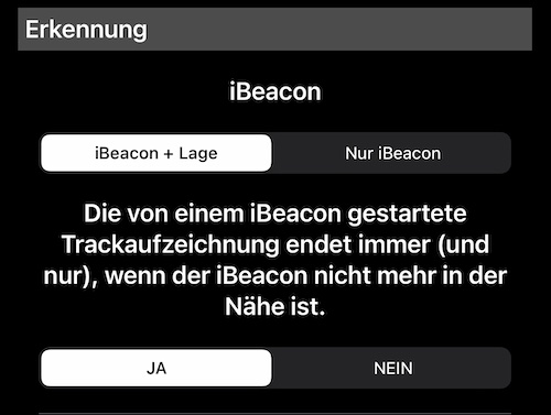 - Abhängig von der Empfindlichkeitseinstellung zeigt die Zeile „Tracking auslösen“ JA an, wenn die aktuelle Konstellation von iBeacon und iPhone das Tracking auslöst, oder NEIN.