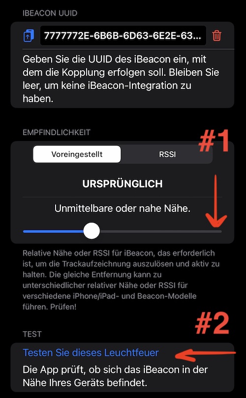 Sobald eine gültige UUID eingegeben wurde, können Sie die App-Empfindlichkeit für dieses Beacon anpassen und testen, ob es richtig erkannt werden kann.