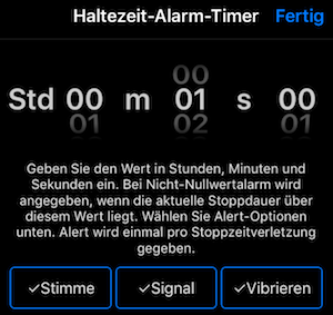 Sie können sowohl den Alert-Timer als auch die Optionen für die Alarmierung als Voice, Beep oder Vibrate einrichten: