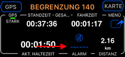 Überwacht Bewegung/Standzeit und Durchschnittsgeschwindigkeit. Warnt, wenn die aktuelle Anhaltezeit über dem Schwellenwert liegt.
