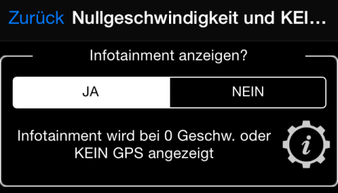Beim Warten auf Ampeln oder im Stau können Wetterdaten, Reisestatistiken und Twitter-Chronik angezeigt werden. Aktivierbar in „Erweiterte Einstellungen" > „Nulldrehzahl und KEIN GPS" > „Infotainment anzeigen". Extra-Einstellungsbutton bietet Optionen für granulares Infotainment-Setup: