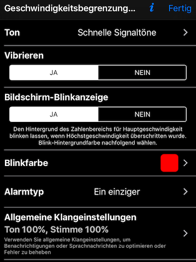Neu ab Version 1.8.2 ist die Möglichkeit, den Alarm so einzustellen, dass er nur einmal bei jeder Übergeschwindigkeit (neu) gegeben wird, oder bei Überdrehzahl kontinuierlich alarmiert.