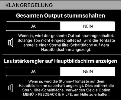 Die Tonsteuerung wird immer dann auf dem Bildschirm angezeigt, wenn der Ton aus der App stummgeschaltet ist oder wenn Sie JA für “Stummschaltung auf dem Hauptbildschirm anzeigen” wählen: