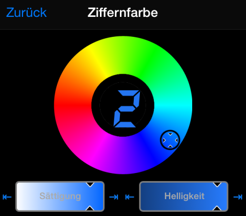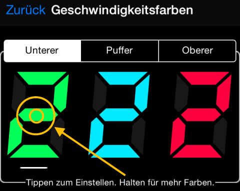 Ziffern in beliebiger Farbe anzeigbar. In „Erweiterte Einstellungen" > „Tachofarben" oder „Heads-up- und Vollbildoptionen" auf eine Zahl drücken, um Farbauswahl zu öffnen.