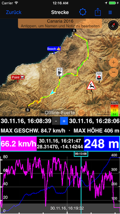 Entdecken Sie Ihre Tracks, indem Sie sie auf der Karte und mit der Unterstützung eines Diagramms, wo Sie tippen / schwenken / Zoom, um auf das Zeitintervall oder einen beliebigen Punkt zu konzentrieren. Dies ist die Option “Map + chart” (Standard) im Track Viewing Screen: