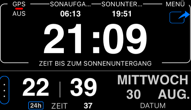 Bildschirmhintergrund-Blinkanzeige bei Überschreitung der Höchstgeschwindigkeit, Zeit bis zum Sonnenuntergang