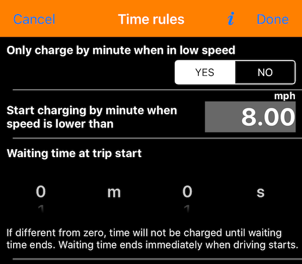 Neu in der Zeitverwaltung in Version 1.6 ist die Möglichkeit, eine “Wartezeit beim Start” einzustellen. Die Idee hier ist, dass Sie zur Abholadresse kommen, die Reise beginnen und wenn Sie 5 Minuten Wartezeit in Ihrem Startpreis haben, startet die App den Countdown von 5 Minuten auf Null, ohne den Zähler zu berühren. Wenn die Wartezeit überschritten wird, wird die Zeitgebühr pro Tarifregel hinzugefügt. Diese ganze Sache ist absolut optional.