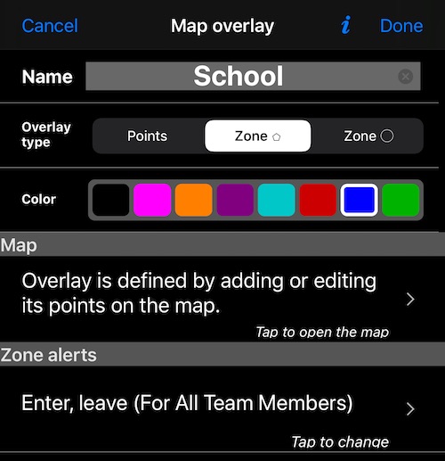 Wenn Sie eine Zone einrichten, tippen Sie in diesem Bildschirm auf Kartenzeile, um die Karte zu öffnen und die Überlagerung der Zone einzurichten . Für Polygone erstellen Sie eine Überlagerung auf einer Karte, indem Sie Punkte ablegen. Für kreisförmige Zonen legen Sie einen Mittelpunkt ab, verschieben die Karte an die Zonengrenze und bestätigen mit der Schaltfläche oben rechts ✓ (Häkchen).