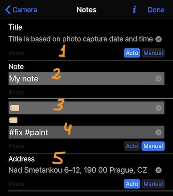 By default, photo title (1) is pre-populated by the date-time. To change this to your own title, tap on a “Manual” button under the Title field and enter your own title.