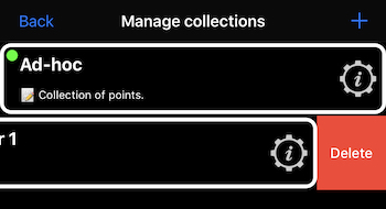 Then tap on “POINT COLLECTIONS” menu item and in the folder/collections list swipe from right to left on the collection row to delete and confirm by tapping on a “Delete” button: