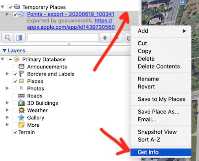 1. Open kmz file in Google Earth for PC or Mac and right click on it’s root folder, click on Get Info: