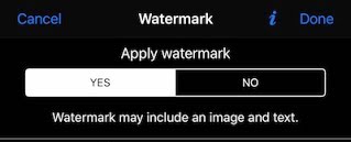Configure it via Settings > Capture settings > Watermark section. Tapping on a watermark section row opens watermark editor. Its top part allows you to setup either watermark should be applied or not: