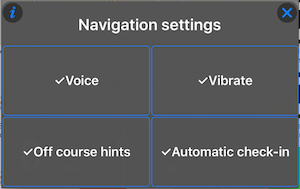 Off course hints - when on, the app will announce you distance to the target and current direction to it whenever your course started to be different from the expected one, plus/minus within tolerance.