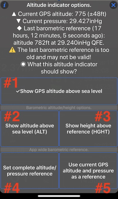 Altitude indicator menu offers an option to use current GPS altitude and air pressure as a reference (#5) or you can use “Set complete altitude/pressure reference” option (#4) to setup arbitrary correspondence between altitude and pressure:
