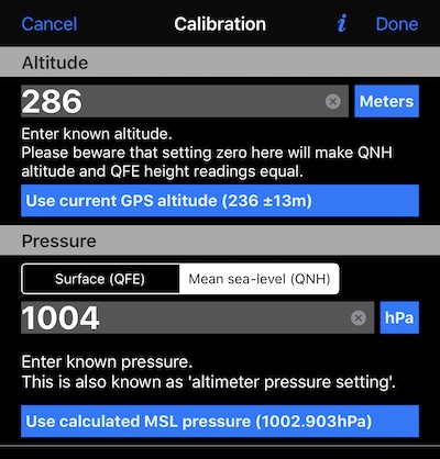 Calibration options include setting altitude and corresponding to it Surface (QFE) or Mean sea-level pressure (QNH).