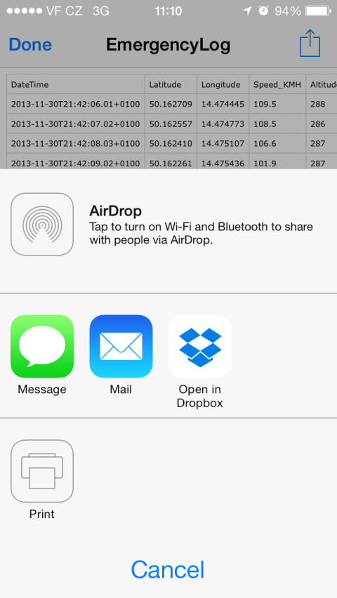 You can see why we picked exactly the standard Apple’s way of using a Preview screen before. Whatever apps you have on your iPhone/iPad that would be capable of working with the black box file, they will be available here. Example above shows an option to save to Dropbox. If your iPhone/iPad would have apps installed to work with plain .csv files (which black box file is), they all will be shown here, as Dropbox is in our case. As minimum, on every iPhone and iPad, you’ll have an airdrop, email and print options (given you have iOS 6 or 7).
