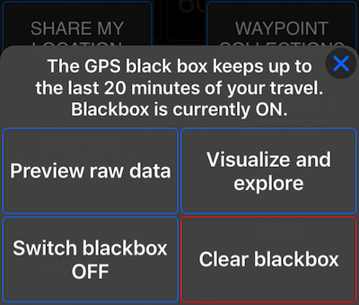 You can show the black box data to view or share them, disable the black box data recording and clear the current black box data without disabling further recording. As blackbox is using the same recording function as GPS tracking function, when you have tracking active, GPS blackbox can’t be switched off or cleared. You need to stop a track recording first.