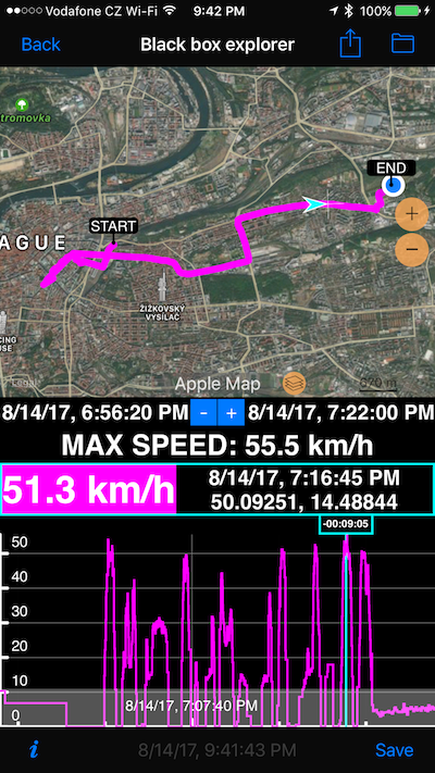 Now you can respond to any speeding accusation by selecting the time span under question and showing your max speed in it. More granularity is required? Move point line to the exact time under question!