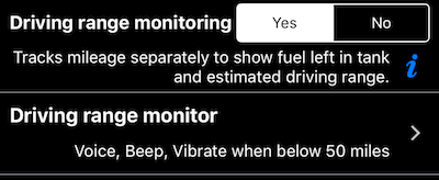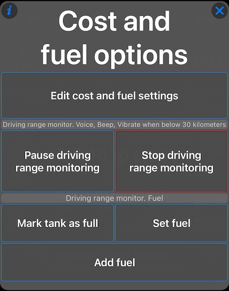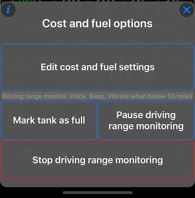 Once you have range monitoring active tapping on the button #1 provides option to edit cost and fuel settings, plus range monitor options: