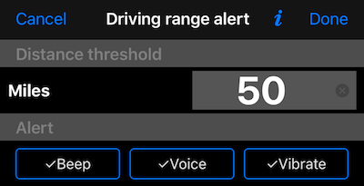 Allows to “monitor” fuel left in the tank and be alerted when expected driving range goes below pre-defined distance in miles, kilometers or nautical miles.