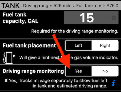 Be sure to setup fuel efficiency (MPG, Liters per 100 km, etc) on the cost/fuel settings page and tank size in galons or liters. Down to a bottom of this screen there is a switch for the range monitor: