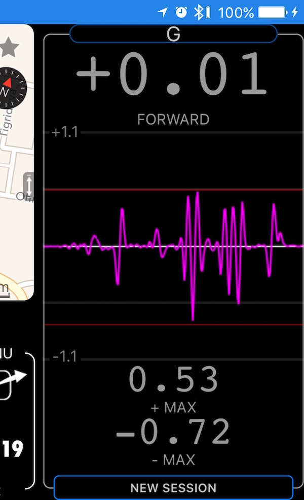 “New session” button allows to restart the measurement session by reseting max forward and braking acceleration values and getting speedometer ready for the new calibration cycle.